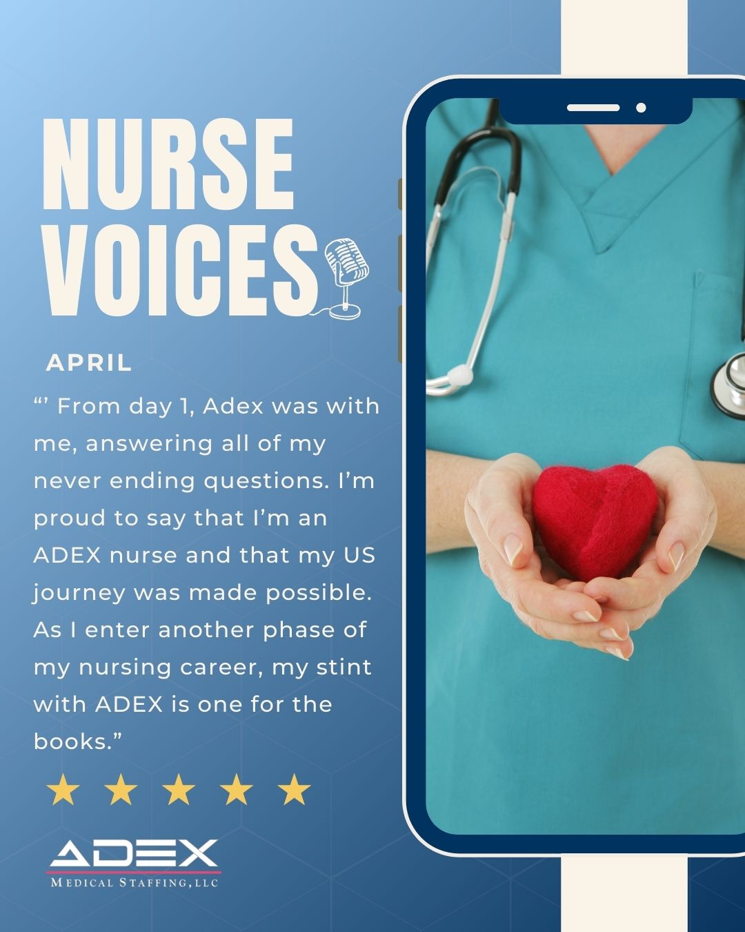 We’re grateful that April trusted ADEX to be part of this important chapter and proud to support nurses as they navigate their professional paths with confidence and care.